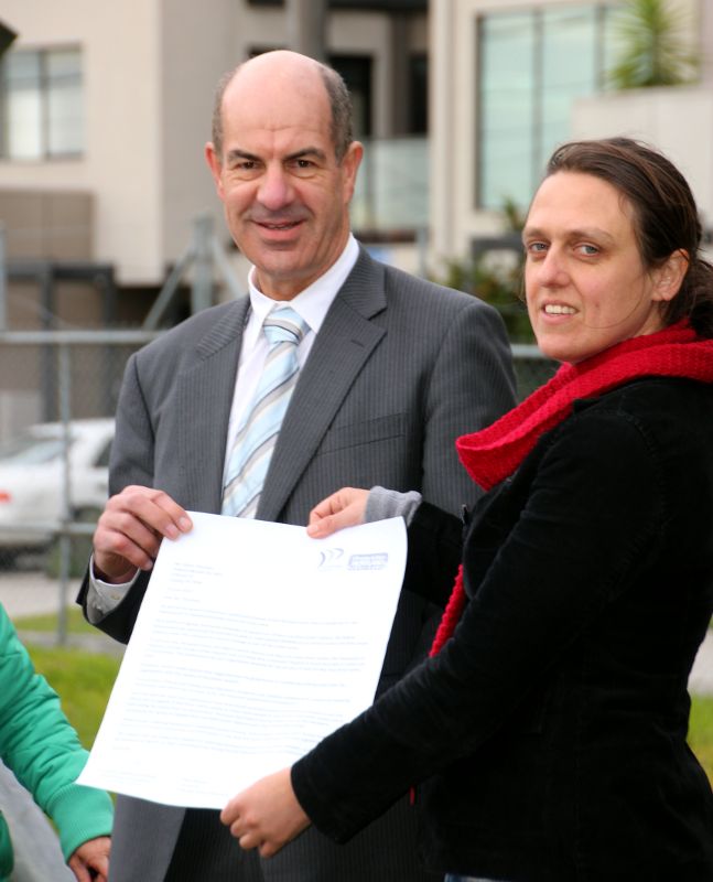 Ellen Roberts from Climate Action Moreland handed the signed letter to Kelvin Thomson while members of her group looked on and held letter placards saying ‘Replace Hazelwood"’.