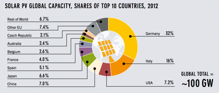 On a global level, Italy (16%) & Germany (32%) accounted for almost half of global solar PV capacity installed up to 2012, according to The Climate Group (@ClimateGroup) in a tweet.