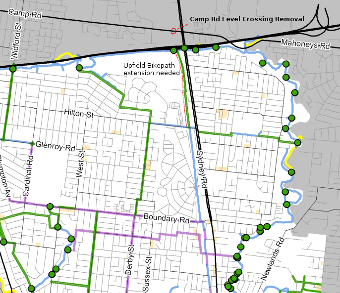 As for extending the Upfield Path, I won’t be satisfied with anything less than it reaching Thompson or Sunshine Streets, providing safe access to Campbellfield. Extending the path from Gowrie to the Ring Road Path is not affected by Camp Rd crossing removal – it IS affected by construction of duplicated track which might or might happen as part of the project. Extending the Upfield Path to Camp Rd is of no effective or safe benefit to cyclists as it does not connect to any cycling network other than for cyclists who are happy to ride onroad of an arterial road. The path must go beyond Camp Rd, and as you suggest, it must have a safe crossing of Camp Rd.