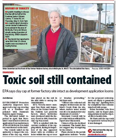 Two properties in McBryde street Fawkner were the location of a NuFarm factory which manufactured herbicides, agent orange and other chemicals in the 1960s with dioxin a noted byproduct. The site has been called one of the top 10 most toxic sites in Australia.