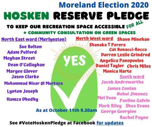 Local action group Keep Hosken Reserve accessible for all have asked all Moreland Council candidates to sign a pledge to defer any tender approval or redevelopment work on the Reserve and call for a full report from Council officers on what consultation and engagement has ocurred since the start of the Hosken Reserve Redevelopment Plan.