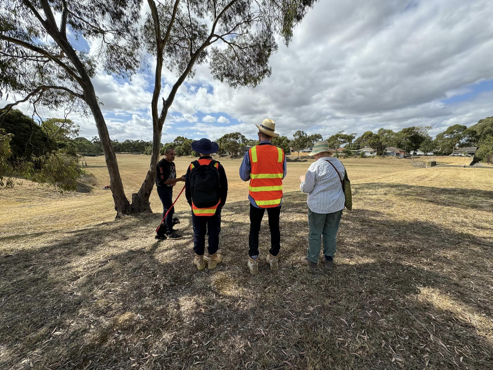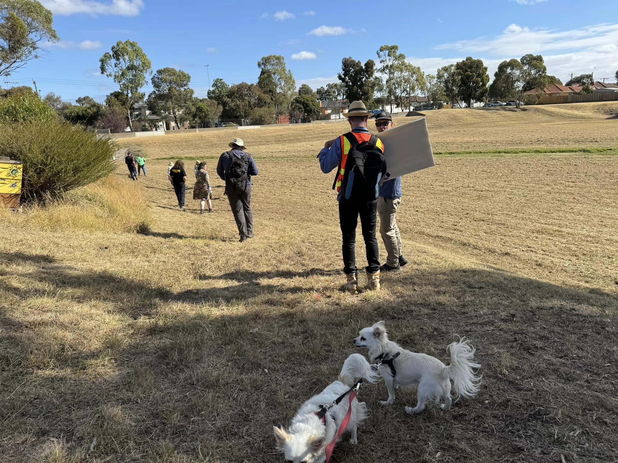 Campbellfield Creek Retarding Basin. This will have a loop track about 1km on the outside. Path down into the wetlands with a bird hide. Some revegetation. Access points discussed but include from Sages Road and the north side from the Cemetery, perhaps on the west side Cemetery. The wetlands has kangaroos and birdlife. Kangaroos were seen in the wetlands area and further north in the cemetery while we were there. Needs signs about don’t feed the kangaroos. The biodiversity and habitat values are important to preserve and enhance here. Paths should be nominally designated shared use allowing cycling. Discussion on restricting dogs to on lead only or ban them.